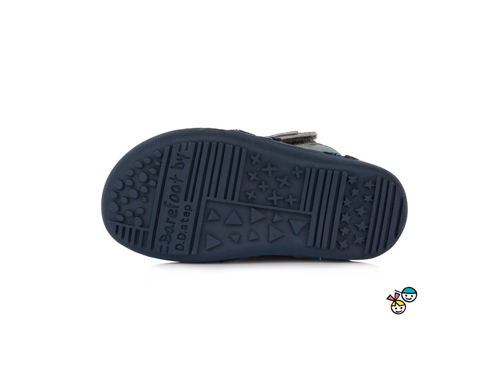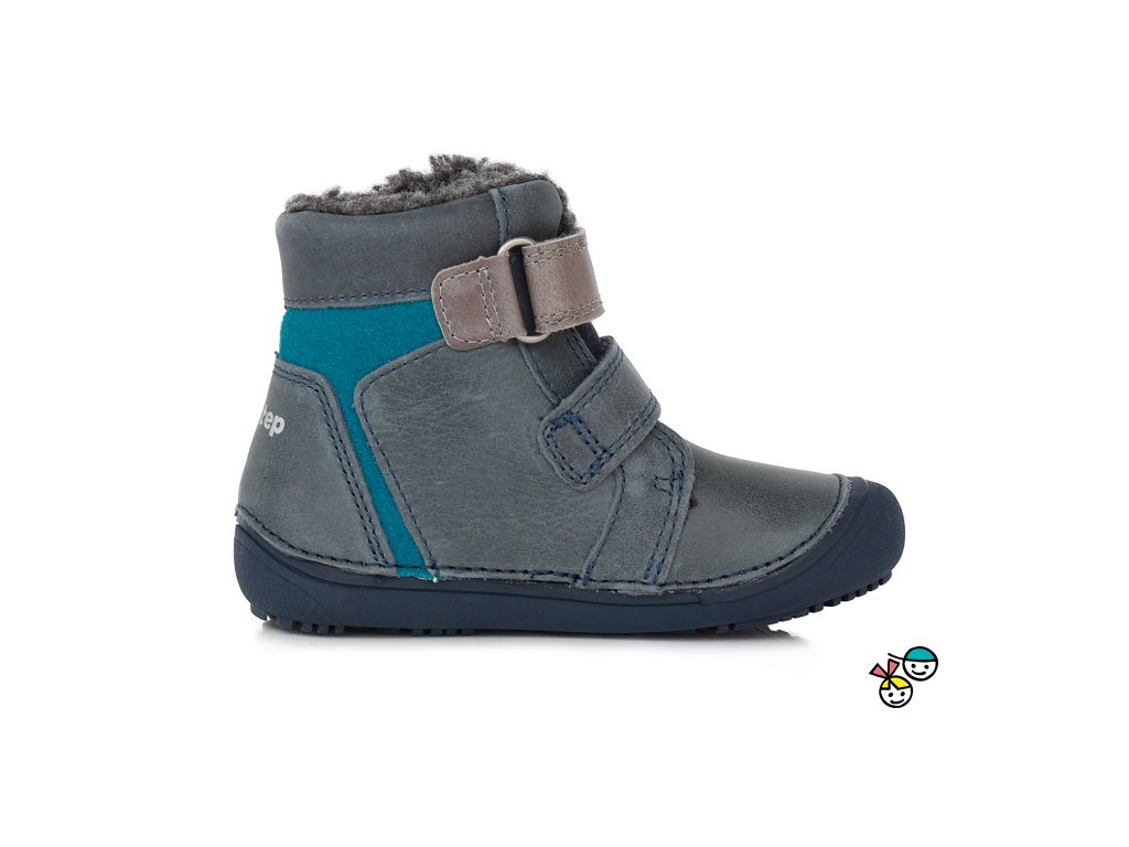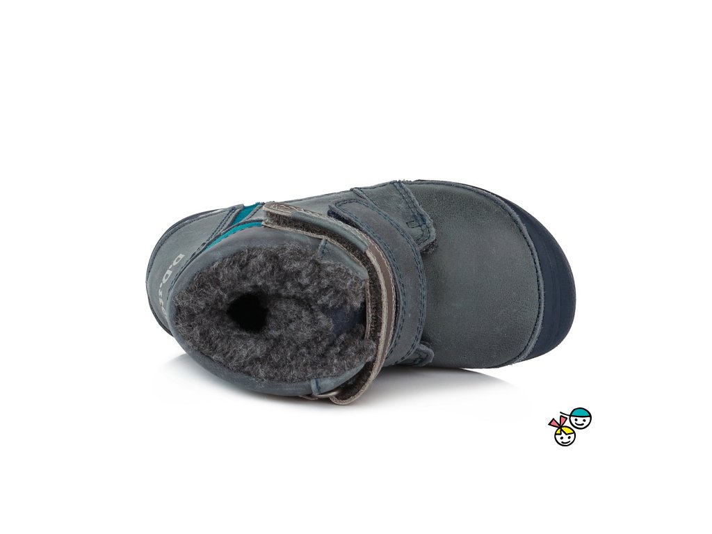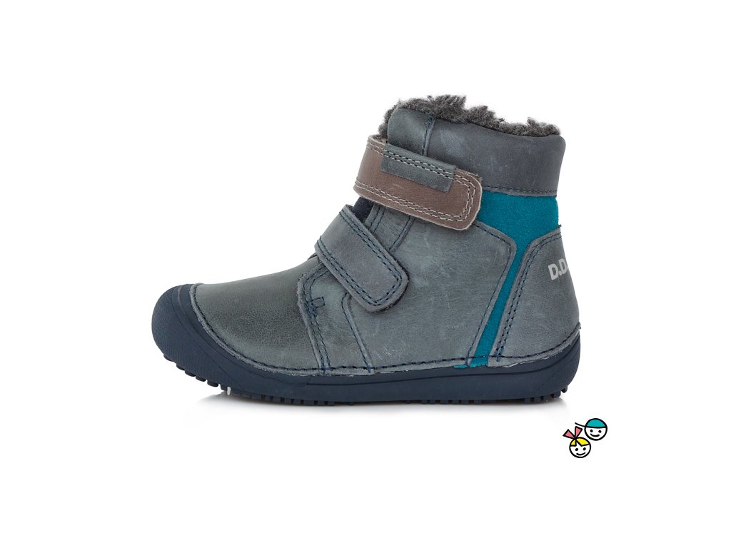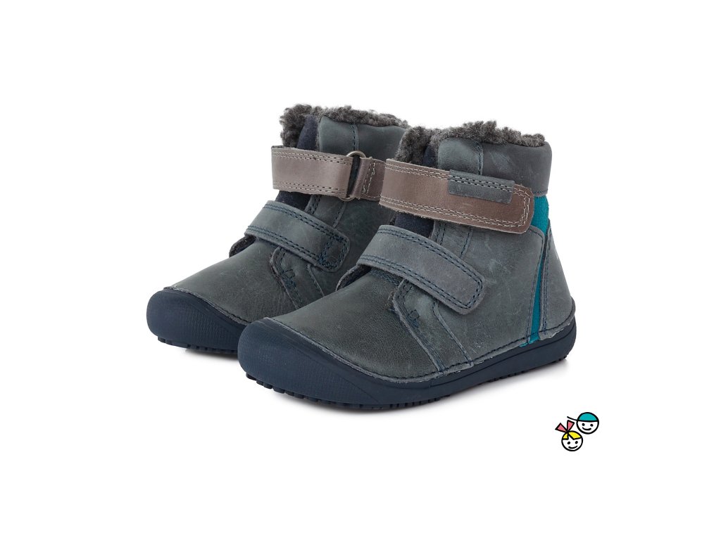 Zimní barefoot kotníčková obuv D.D. Step s velmi ohebnou podešví v modro-šedé kombinaci.