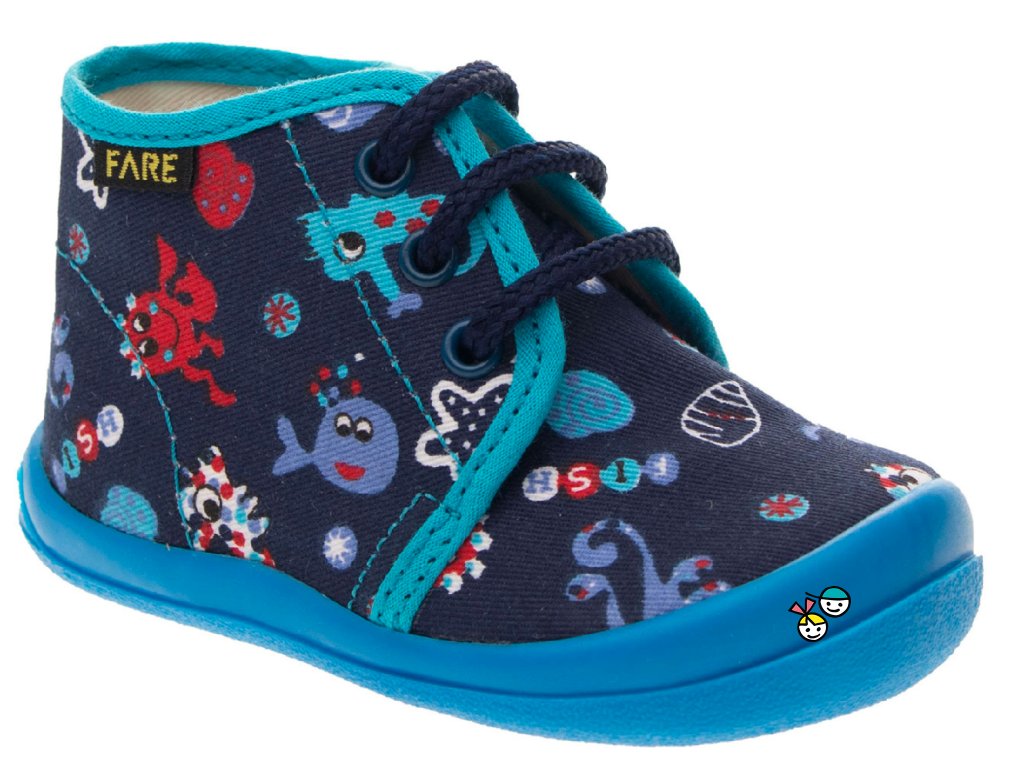 Pohodlné bačkůrky/plátěnky Fare v modré barvě s motivem moře. Pro první krůčky, na tkaničky.