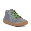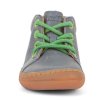 Kožené kotníčkové barefoot botičky v šedé barvě se zelenými tkaničkami pro první krůčky.